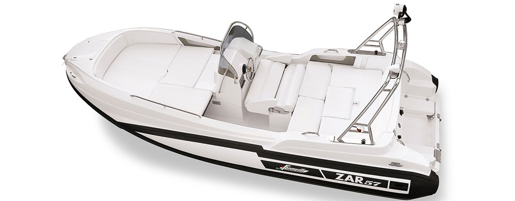 Same features of the classic ZAR 57 WD improved with white/grey carbon style cushions upholstery, sport driving wheel, swim platforms, switch panel.