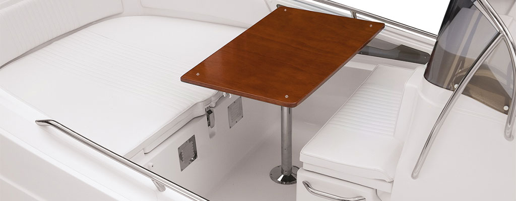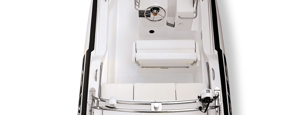 Complete with VTR two-seater drive console with front seat for two and peak, rudder and handrail of stainless steel, hydraulic steering, windshield, one indoor compartment, n 2 doors, front console seat cushion and seat back; anatomic driver’s seat for two permitting driving in a semi-seated position; stainless steel ladder with 2 dashboards on VTR; 4 bollards, 3 stainless steel handles, 2 rubbon handless, 2 stainless steel grab rods in prow; stainless steel