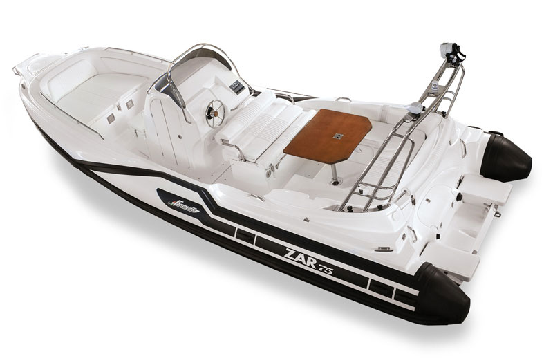 Same features of the classic ZAR 75 Plus improved with white/grey carbon style cushions upholstery, sport driving wheel, swim platforms, switch panel