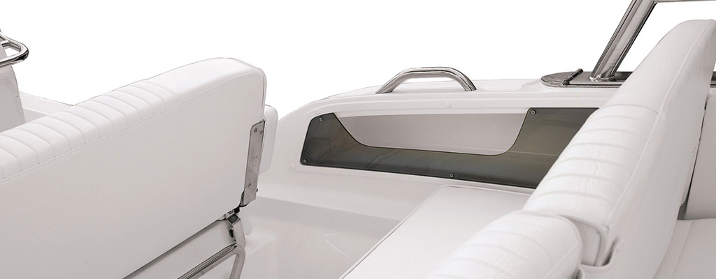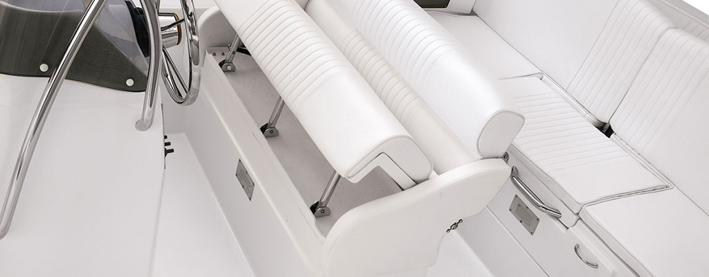 Complete with VTR two-seater drive console with front seat for two and peak, rudder and handrail of stainless steel, hydraulic steering, windshield, one indoor compartment, n 2 doors, front console seat cushion and seat back; anatomic driver’s seat for two permitting driving in a semi-seated position; stainless steel ladder with 2 dashboards on VTR; 4 bollards, 3 stainless steel handles, 2 rubbon handless, 2 stainless steel grab rods in prow; stainless steel