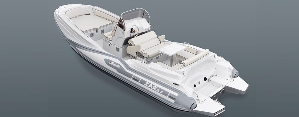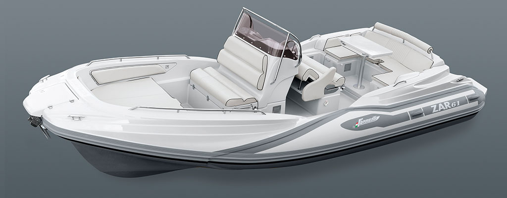Same features of the classic ZAR 61 Plus improved with white/grey carbon style cushions upholstery, sport driving wheel, swim platforms, switch panel