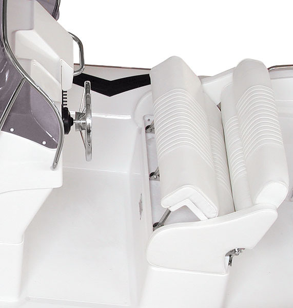 Complete with VTR two-seater drive console with front seat for two and peak, rudder and handrail of stainless steel, hydraulic steering, windshield, one indoor compartment, n 2 doors, anatomic seat cushion and seat back for front console seat; anatomic driver’s seat for two permitting driving in a semi-seated position; stainless steel ladder with 2 dashboards on VTR; 4 bollards, 5 stainless steel handles, 4 rubbon handless, 2 stainless steel grab rods in prow; stainless steel anchor winch nose with stainless steel shield; 7 kg stainless steel anchor; gas springs for afterpeak and forepeak covers; prow cushion; stern cushion; stern headrest cushion; padded stern backrest which may also be used to extend stern sun bed; 3 headrest cushions for prow; tank of about 200 lt. installable in accordance with EC regulations; repair kit; inflation pump; pressure gauge, paddle oars. (All cushions are made of closed cell expanded polyurethane.)